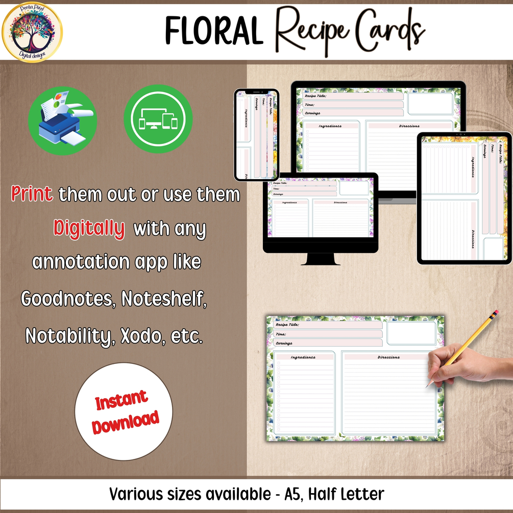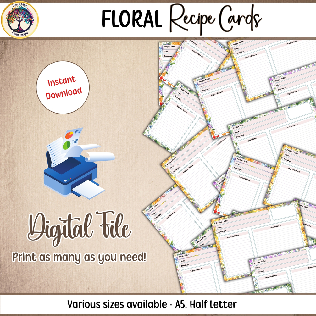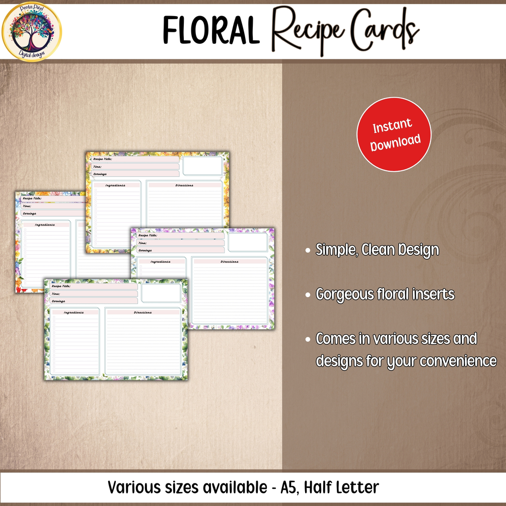 Step into a world where culinary art meets botanical beauty with our Floral Recipe Cards - the ultimate kitchen companion for every home chef and baker with a taste for elegance. These printable cards bloom with four exquisite floral designs, adding a dash of charm to your recipe collection.