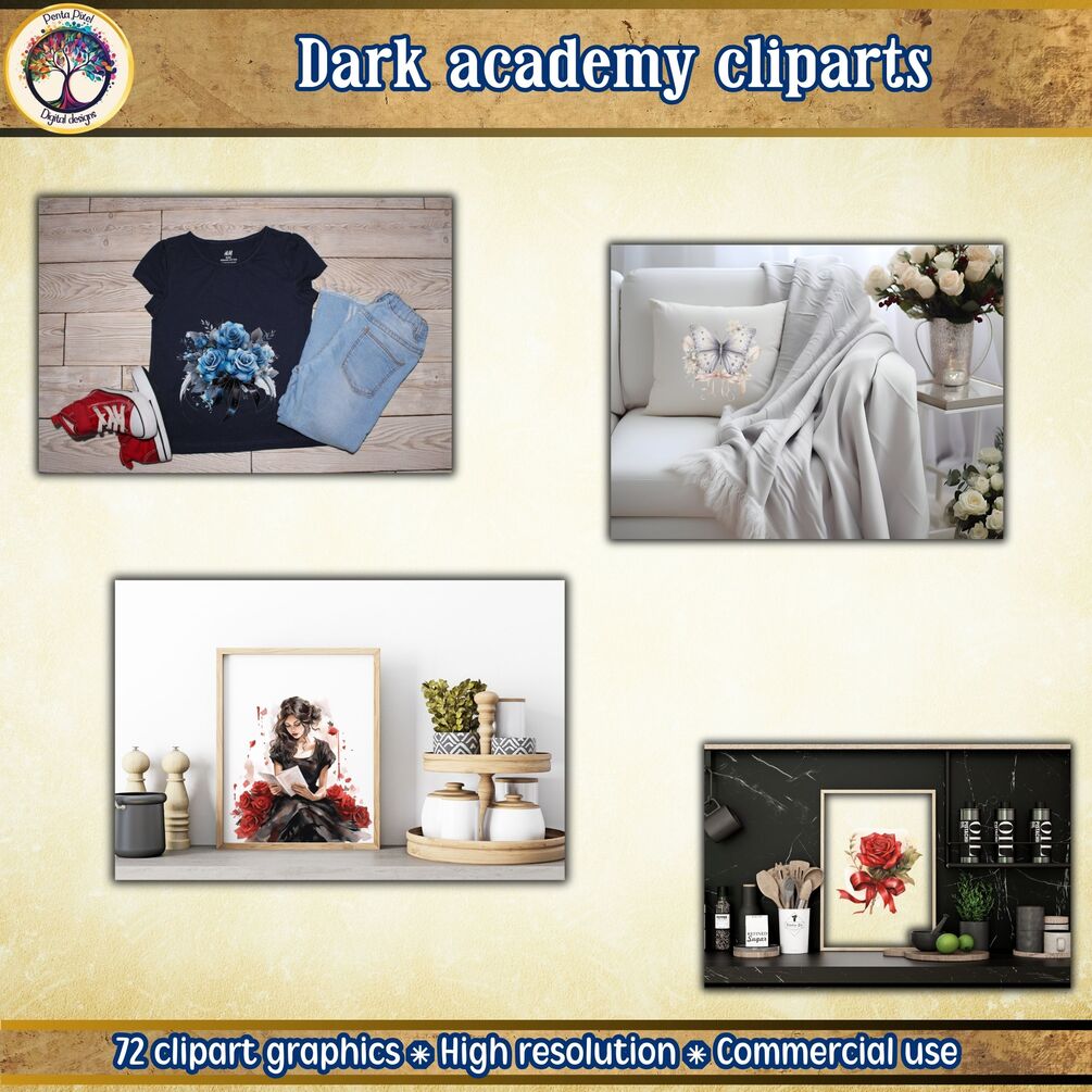 Envision bouquets of dusky roses perched atop stacks of classic literature, butterflies that seem to flutter off the canvas, and fashion that whispers tales of yesteryear. This collection is perfect for enhancing your creative projects with a touch of elegance and mystery. Whether you're crafting invitations for a book club gathering, designing a literary-themed event, or curating your digital mood board, our clipart offers versatility and inspiration.