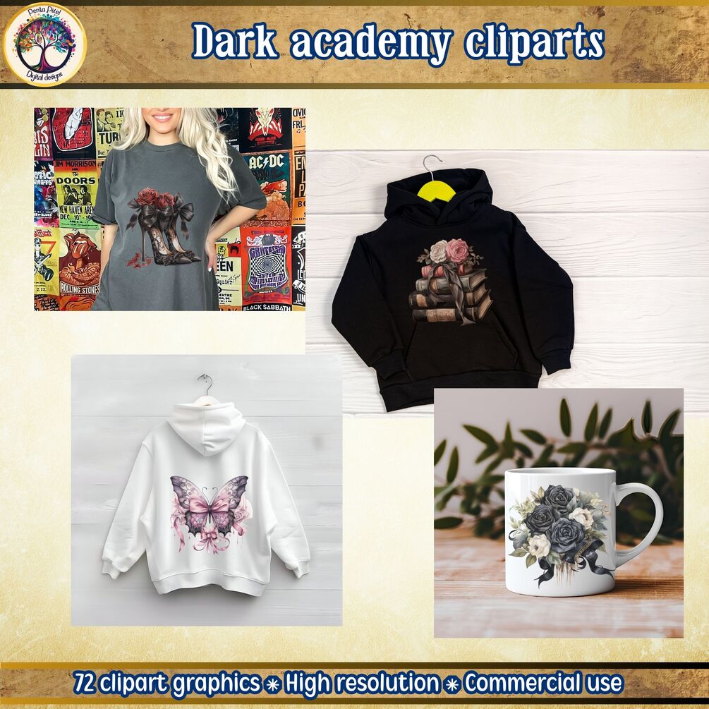 The graphics are delivered in PNG format, ensuring clear backgrounds for seamless integration into your projects. Plus, with commercial use rights, you can weave these elements into your items for sale, such as custom T-shirts, hoodies, mugs, and wall art. Begin your journey into the shadowy corridors of imagination with this curated selection of dark academic treasures.